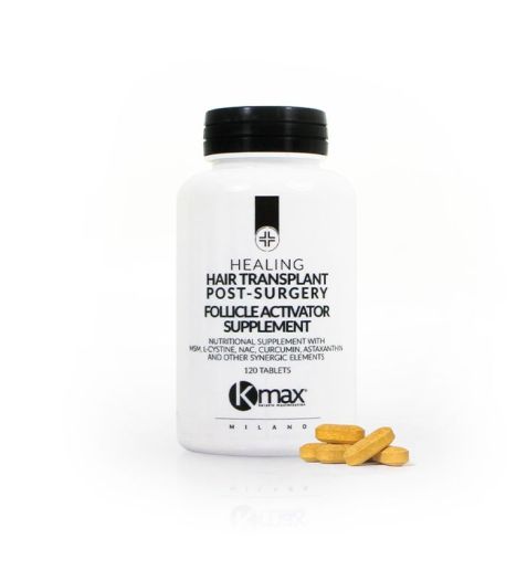 Kmax Healing Hair Transplant Post-Surgery Follicle Activator Supplement és el suplement capil·lar que forma part del Kmax Healing Hair Transplant Post Surgery Kit: el primer conjunt de productes específicament formulats per cuidar els cabells i el cuir cabellut després d'una intervenció de trasplantament capil·lar.