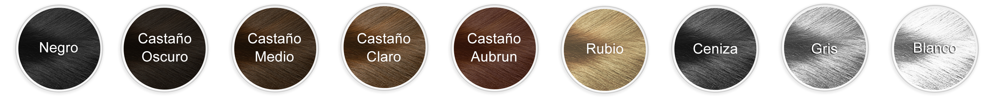 Kmax fibras capilares esta dispone en 9 colores: negro, castaño oscuro, castaño auburn, castaño medio, castaño claro, rubio, ceniza, gris y blanco.